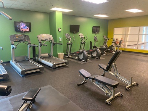 The exercise room has several treadmills, ellipticals, stationary bikes, free weights, tree weights, exercise balls and mats.